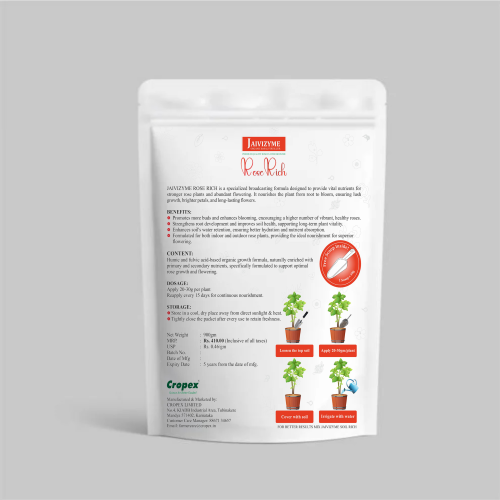 Cropex Jaivizyme ROSE RICH is a targeted plant nutrition formula made specifically for rose lovers. This powerful yet gentle organic rose fertilizer boosts bud formation, strengthens roots, and helps your plants produce bigger, brighter, and longer-lasting flowers.