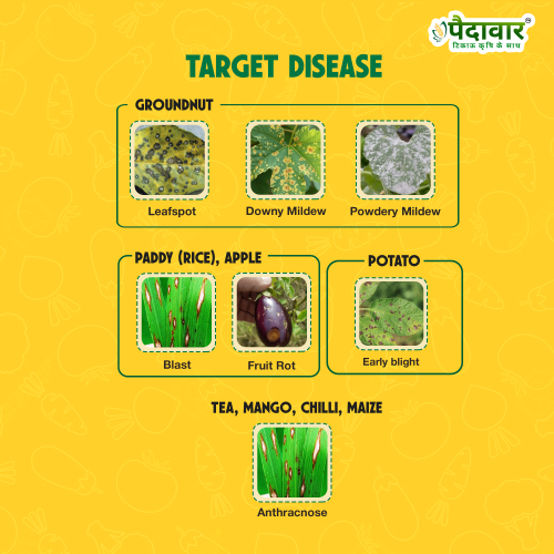 Targeted Diseases: Effective against collar rot, fusarium wilt, anthracnose, alternaria leaf spot, myrothecium leaf spot, pod and stem blight, fruit scab, powdery mildew, downy mildew, leaf spot complex, fruit rot, blister blight, grey blight, red rust, die-back, black rot, and black scruff.
