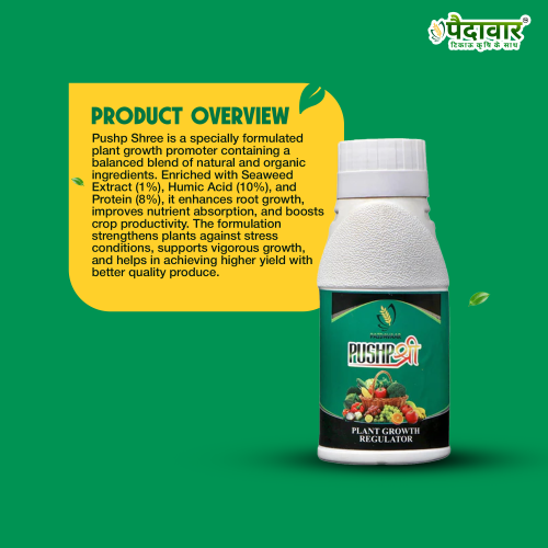 Pushp Shree is a specially formulated plant growth promoter containing a balanced blend of natural and organic ingredients. Enriched with seaweed extract (1%), humic acid (10%), and protein (8%), it enhances root growth, improves nutrient absorption, and boosts crop productivity. The formulation strengthens plants against stress conditions, supports vigorous growth, and helps in achieving higher yield with better quality produce.