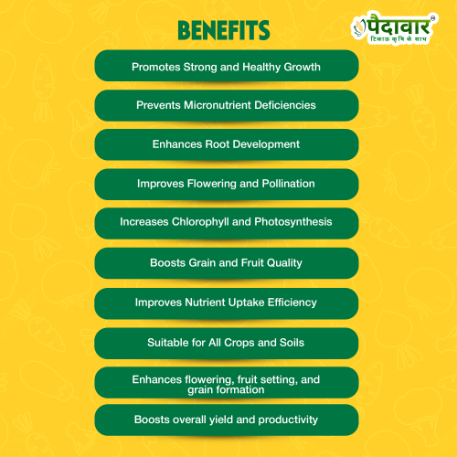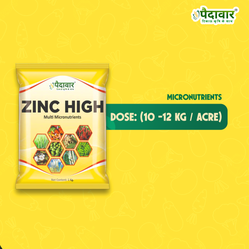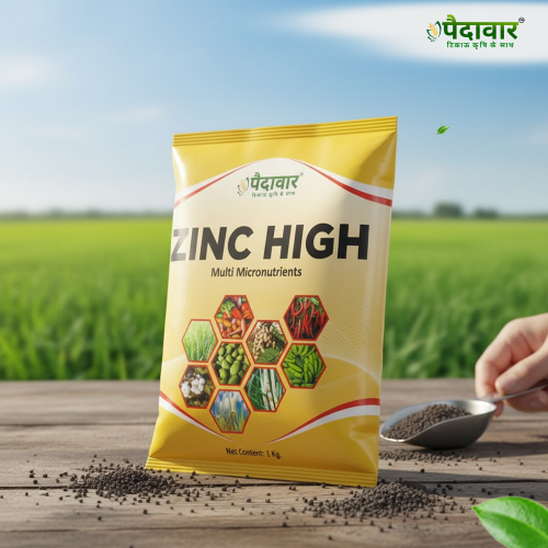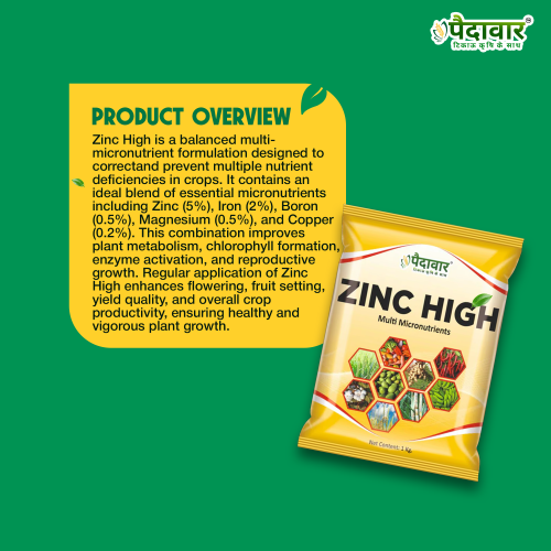 Zinc High is a balanced multi-micronutrient formulation designed to correct and prevent multiple nutrient deficiencies in crops. It contains an ideal blend of essential micronutrients, including Zinc (5%), Iron (2%), Boron (0.5%), Magnesium (0.5%), and Copper (0.2%). This combination improves plant metabolism, chlorophyll formation, enzyme activation, and reproductive growth. Regular application of Zinc High enhances flowering, fruit setting, yield quality, and overall crop productivity, ensuring healthy and vigorous plant growth.