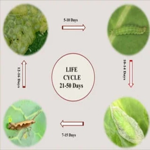 stages: egg, larva, pupa, and adult. Crop damage is caused by the larval stage.