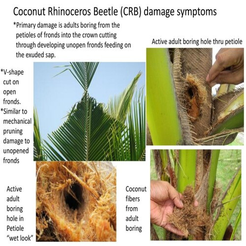 Host Crop: Coconut, Date palm, Oil palm, Arecanut palm Rhinoceros beetles are herbivorous insects named for the horn-like projections on and around the males' heads.