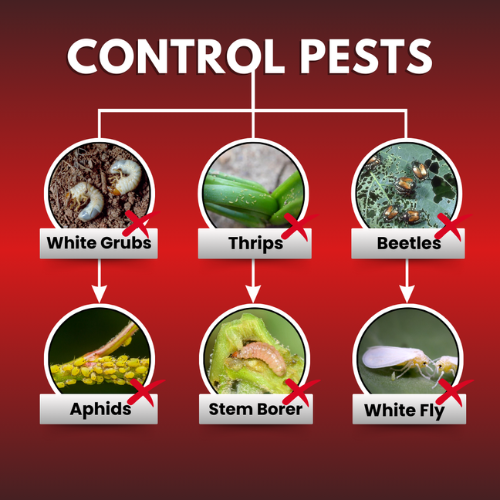 • Targets pests like white grubs, jassids, thrips, yellow stem borers, fruit borers, whiteflies, and aphids.