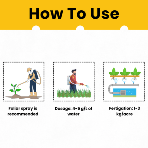 - Fertigation: 1-3 kg per acre.