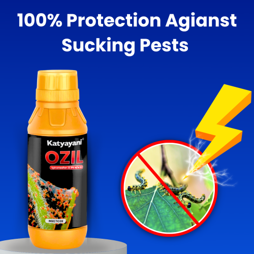 Katyayani Ozil, featuring Spiromesifen 22.9% SC, is a systemic acaricide and insecticide designed to control mites and whiteflies effectively. Its mode of action disrupts lipid synthesis, preventing pests from developing and reproducing. Suitable for crops like brinjal, cotton, tea, tomato, and chili, this product offers excellent pest control while being gentle on beneficial organisms.